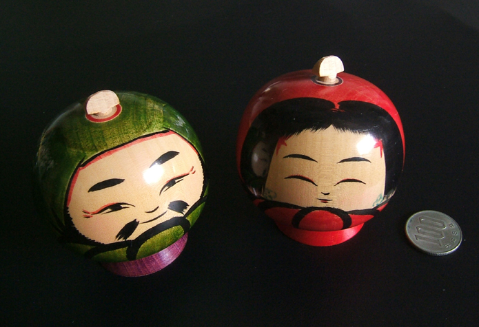 These tops depict a husband and wife. They are a specific type of tsurigoma (string-release tops) called ijiwaru koma (unkind/wicked tops), so-named because they are particularly difficult to spin. The string of the top must be wrapped very precisely and the top thrown just right to get it to spin.
