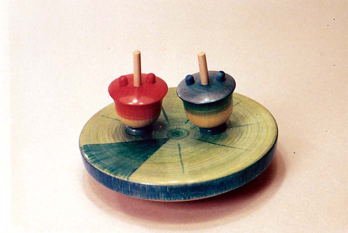 ハスの葉の上で相撲を取っている二匹のカエルがセットになった独楽。カエルはそれぞれハスの葉の上から外して個々の独楽として回すことができる。遊び心にあふれた人気のあるモチーフであり、有名な12~13世紀の鳥獣人物戯画の巻物(下記参照)の中でも描かれたとされるモチーフである。鳥獣人物戯画の一部分では擬人化されたやカエルとウサギが描かれており、お互いに相撲で挑んでいる姿ではないかと考えられている。