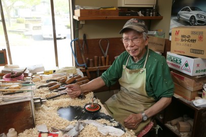 Hiroi: Well, I don’t really say such difficult things like “first step.” It’s [more like] “Do it because you love it.” Anyway, at first you mimic the hand movements, and I teach how to carve. So that anyone can learn it, I take their hands and show them, and after that, little by little back off, so they are doing it on their own. So it’s [learned] rather quickly. People who take a longer amount of time take about half a year before they can make a single top. And people who take a while, there are some that take quite a long time.
