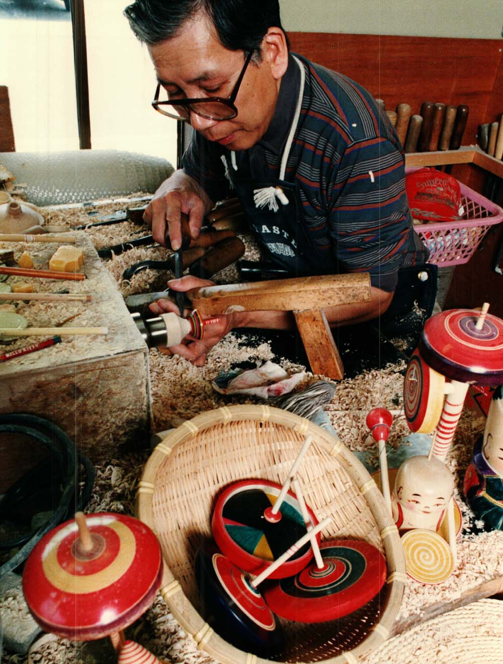 My name was published in kokeshi books, too. And at that time, I realized, “Ahh, in my home there was something even more precious than kokeshi.” There were a lot of kokeshi makers, and they would definitely survive [in the future], but the Edo tops of my family, there was only one house [that made those] in all of Japan. All of the world. The ones who inherited that were only me and my younger brother. Kokeshi [makers] weren’t like us, who were only one family, there were had hundreds, thousands. I realized that it would be impossible to revive it and leave it behind [after we died]. So I thought to myself that I had to increase our apprentices. And young heirs to kokeshi maker families… they came to me, and those young people said “Can’t we make a living not just doing the kokeshi from before?” and “I want you to teach me other things.”