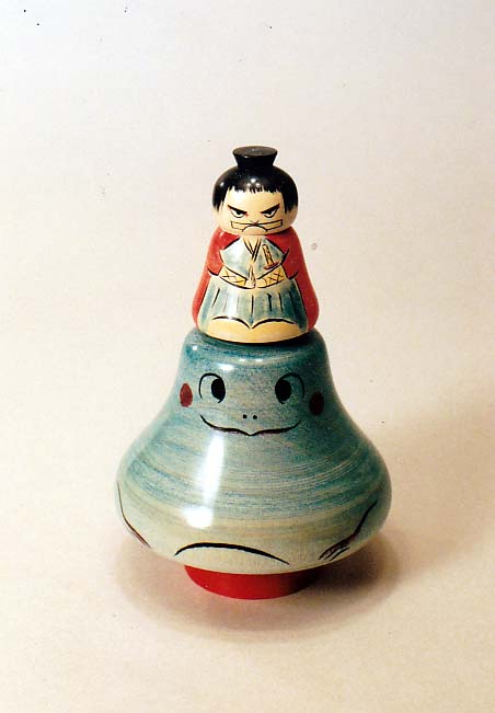 おちょこがテーマである。台風のときに強風で裏返ってしまった傘を握りしめて立っている人形と共に表現されている。独楽自体と独楽の名前が洒落になっている。裏返しになってしまった傘が、おちょこのように見え、さらに裏返しになった傘に雨水が溜まるようになるので、おちょこに酒が注がれたように見えるからである。独楽を回すと、人形がガタガタと音を立て、強風の中で傘にしがみついて頑張っているかのように見える。